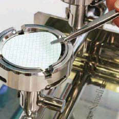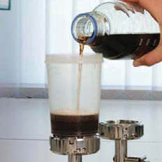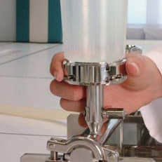 | 图1 取一支灭菌的漏斗,用取膜器分配一张滤膜。 | 图2 将100ml或350ml的漏斗安装于 AS220过滤装置上 |